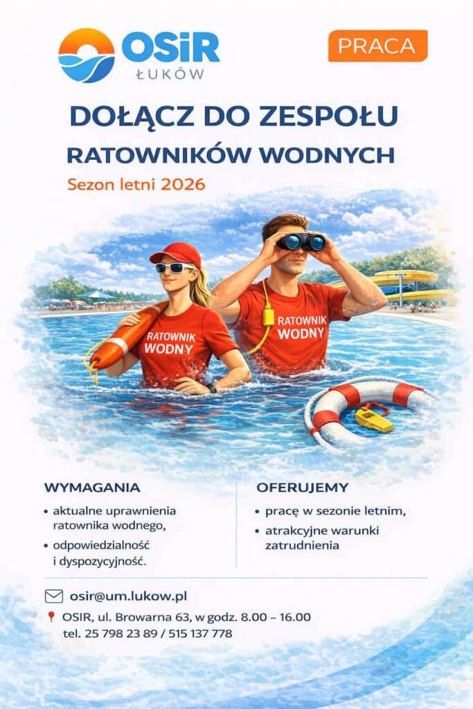 Wyślij swoje CV oraz skany uprawnień na adres: osir@um.lukow.pl w tytule wpisując: „Ratownik 2026 – Imię i Nazwisko” lub przyjdź do Biura OSiR, ul. Browarna 63 w godz. 8.00 – 16.00