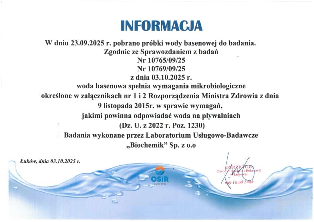 Woda basenowa na Pływalni Krytej „Delfinek” spełnia wymagania mikrobiologiczne i fizykochemiczne określone w załączniku nr 1 i 2 Rozporządzenia Ministra Zdrowia z dnia 9 listopada 2015 r. w sprawie wymagań, jakim powinna odpowiadać woda na pływalniach (Dz. U. z 2015 r. poz. 2016)