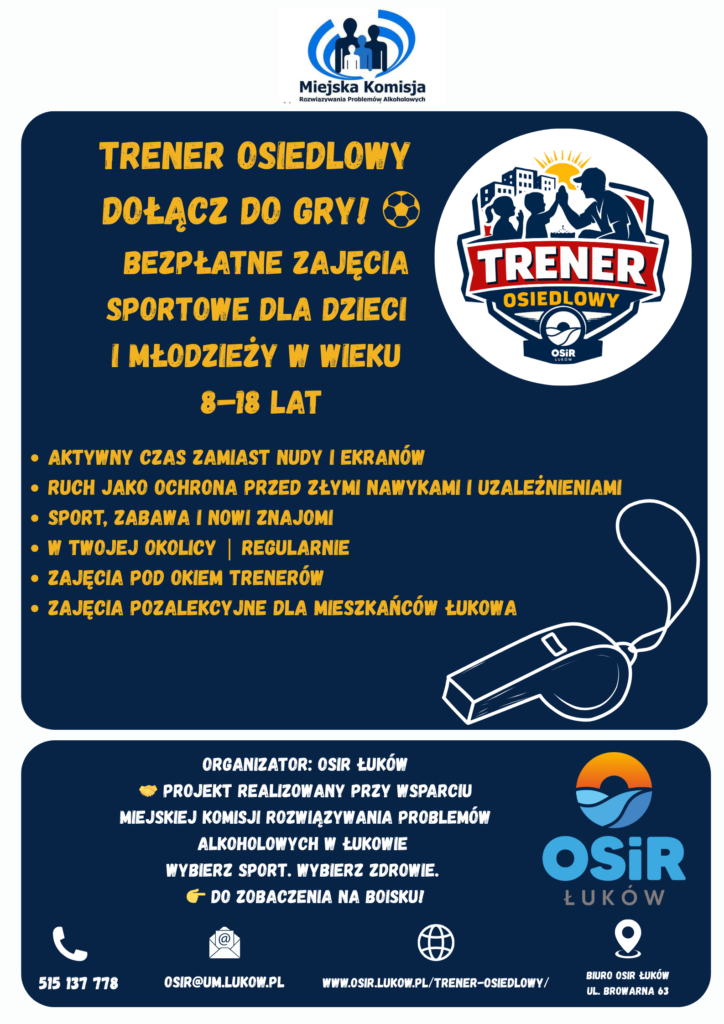 W ramach inicjatywy Trener Osiedlowy dzieci i młodzież mogą uczestniczyć w regularnych zajęciach sportowych prowadzonych przez zespół zaangażowanych trenerów. Każdy z nich wnosi swoją energię, doświadczenie i pasję do pracy z młodymi ludźmi. To przestrzeń pełna ruchu, zabawy i pozytywnej atmosfery. Czas, w którym można rozładować emocje, zadbać o kondycję, poznać nowych znajomych i poczuć, że jest się częścią drużyny. Sport to świetna alternatywa dla nudy i ekranów. To także realne wsparcie w budowaniu zdrowych nawyków i dobrych wyborów. Zapraszamy mieszkańców Łukowa w wieku 8–18 lat do dołączenia do zajęć. Dołącz do ekipy i widzimy się na treningu! Projekt realizowany przez OSiR Łuków przy wsparciu Miejskiej Komisji Rozwiązywania Problemów Alkoholowych w Łukowie. ![]()